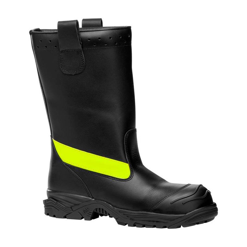 Bota alta de bombero para uso profesional. Piel flor negra, hidrofugada, resistente al agua y fuego, con reflectantes laterales, una nueva suela doble compuesta de caucho nitrilo, puntera de protección, plantilla antiperforación y tallas de 38 a 50.